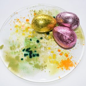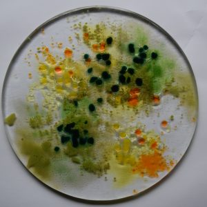 Fused glass flat circular plate with a copper swirl design and white/grey and gold glitter decoration. 30 cm diameter. 8 mm glass.