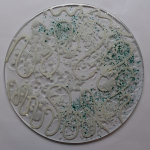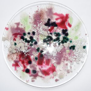 Fused glass flat circular plate with a copper swirl design and white/grey and gold glitter decoration. 30 cm diameter. 8 mm glass.